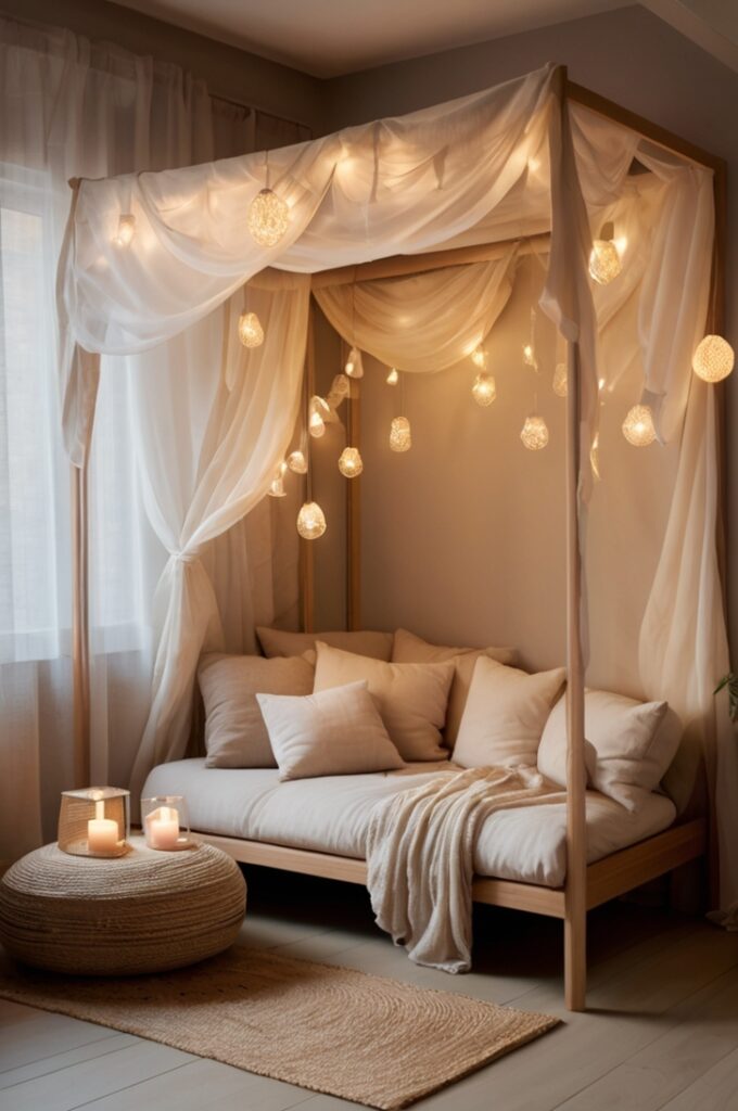 Who says futons can’t be dramatic? Hang sheer curtains from the ceiling so they fall around the futon like a canopy. Suddenly, the simplest setup looks like a retreat straight from a boutique hotel.