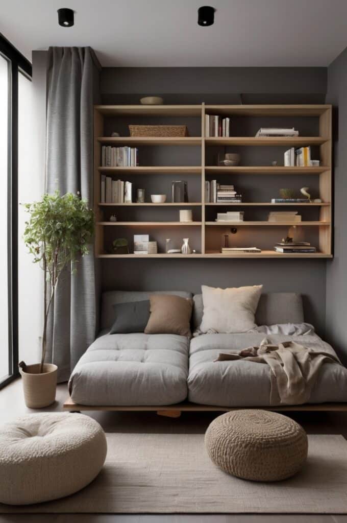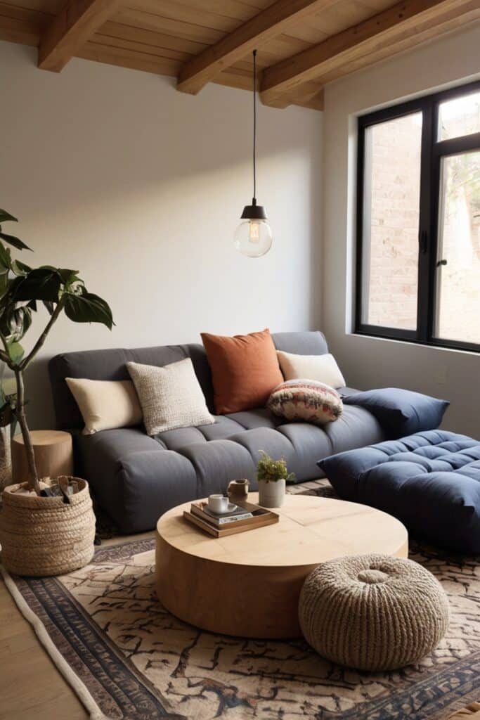 Here’s a trick people sleep on literally. Stack your futon mattress a bit higher and surround it with layers of textured rugs. Toss on oversized floor cushions so the edges blur into lounge seating.