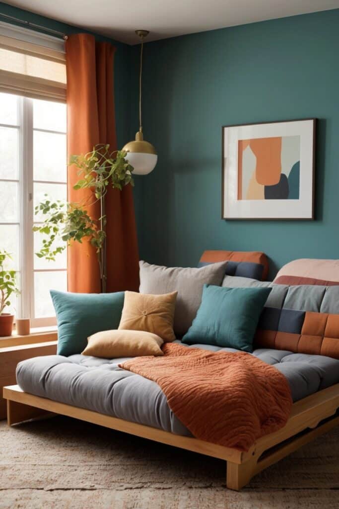 Paint or wallpaper a rectangle or square on the wall where the futon sits. Use a bold shade deep teal, clay red, even ochre. The color zone makes the futon feel anchored without needing a headboard.
