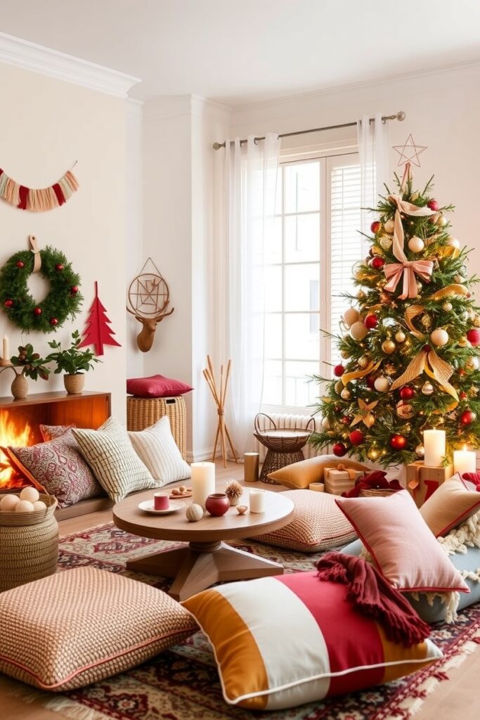 For 2025, boho is more layered than ever with handmade ornaments, woven textures, and unexpected color pops. Combine deep reds with terracotta, mustard, and blush pink. Add pampas grass to your décor (yes, it still works) and don’t forget fairy lights everywhere.