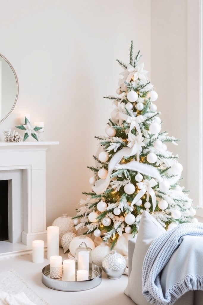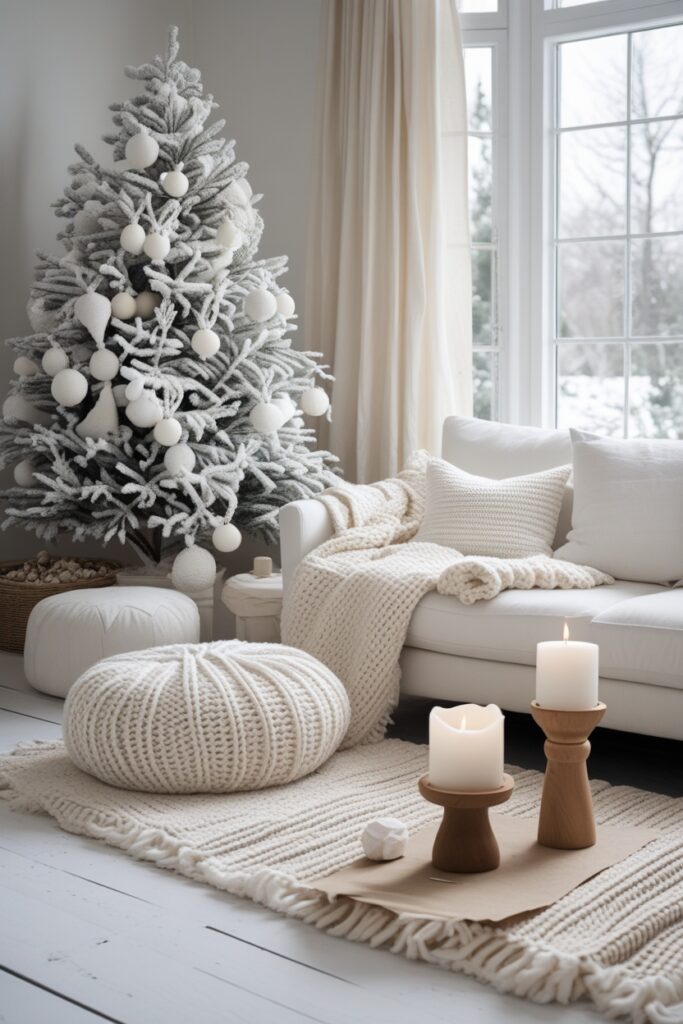 Keep your Christmas tree clean maybe all white ornaments with silver ribbon. Add a pale blue throw blanket or some glass candle holders to tie the look together. The result? A space that feels like stepping into a calm winter morning.