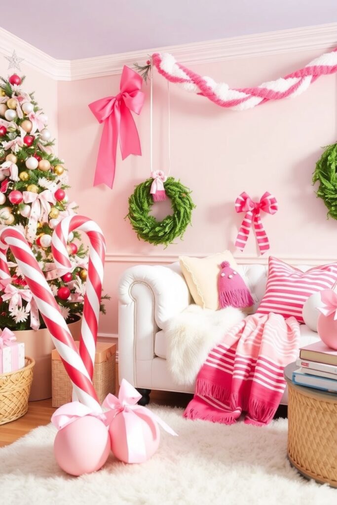 Think giant candy canes leaning by your sofa, soft pink baubles, and striped throws. The trick is to balance the sweetness with neutrals a white rug or soft beige walls to ground it all.