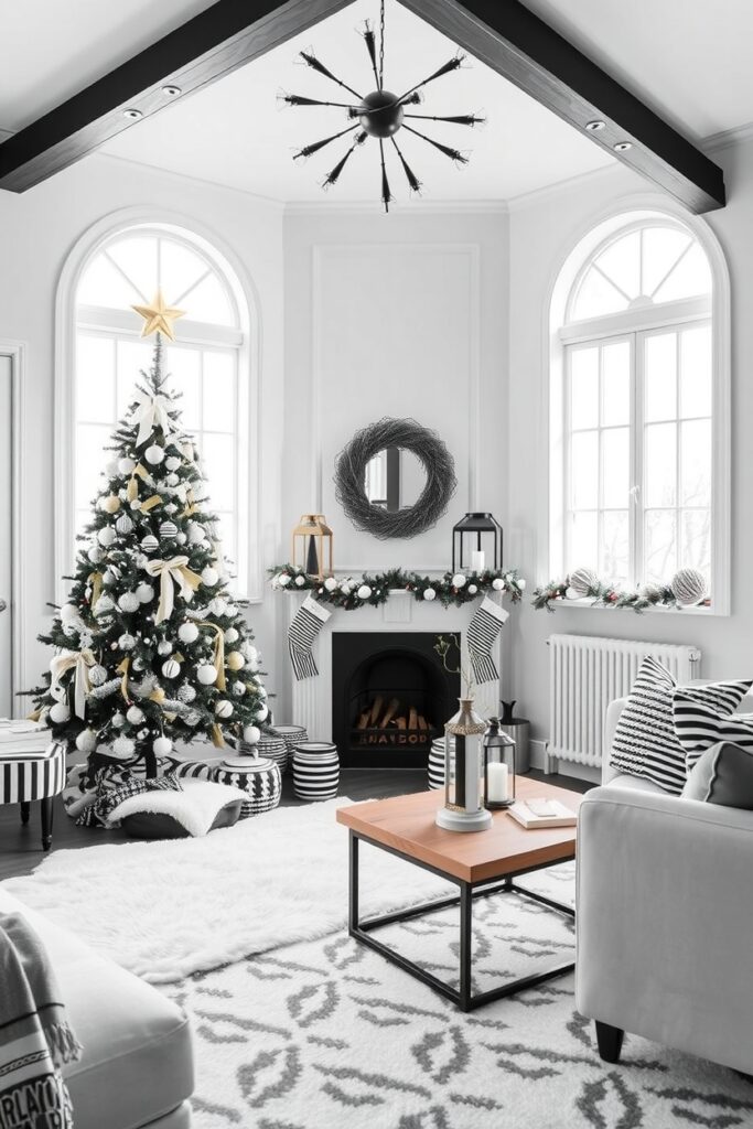 A black metal tree stand, matte white ornaments, and black-and-white striped ribbons simple, chic, unforgettable. Add a sheepskin rug or a wooden coffee table to keep it cozy, not cold.