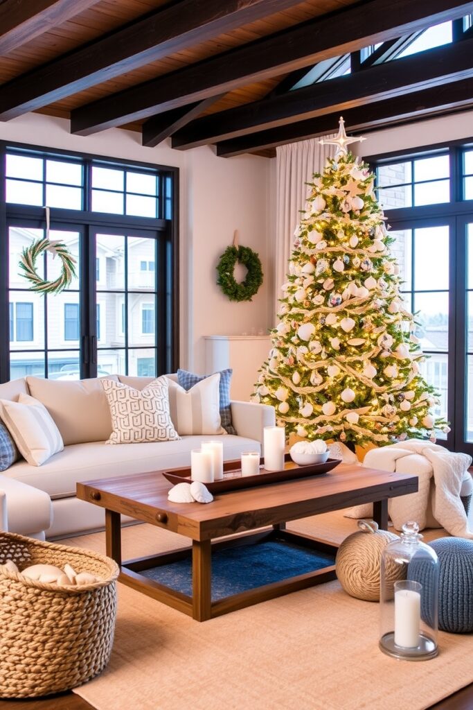 Use soft blues, sandy beige, and driftwood tones. Decorate your tree with shells, sea glass, and rope accents. Add candles that smell like salt and pine yes, that’s a real combo now.