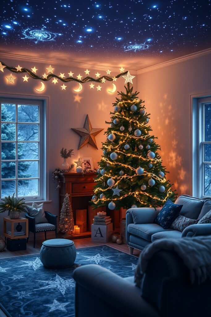 Hang metallic star ornaments, use moon-shaped garlands, and scatter tiny LED lights like a sky of constellations. Go for midnight blue and silver as your main palette.