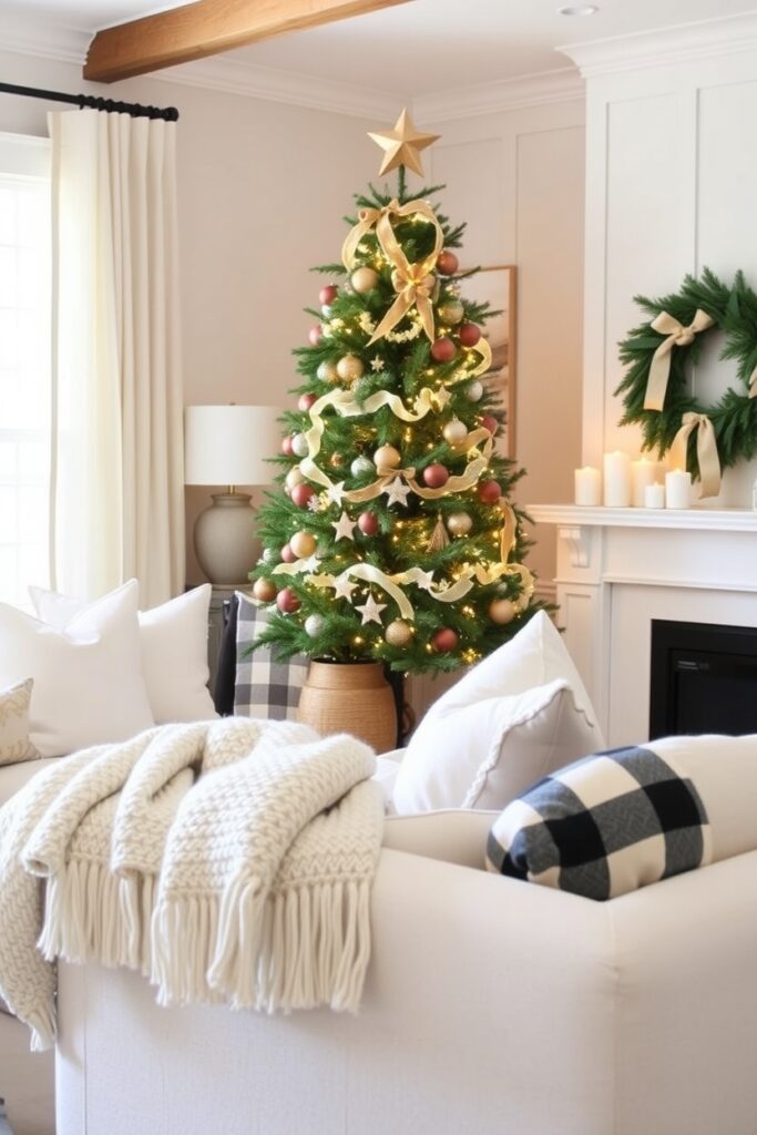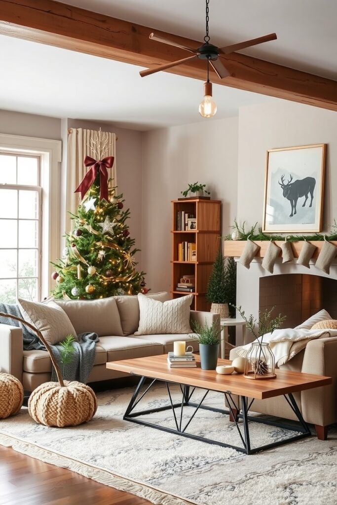 Start with a white or beige base comfy sofas, simple linen curtains. Then add small Christmas touches: a plaid throw, a chunky knit blanket, and a tree decorated in wooden ornaments and neutral ribbons.