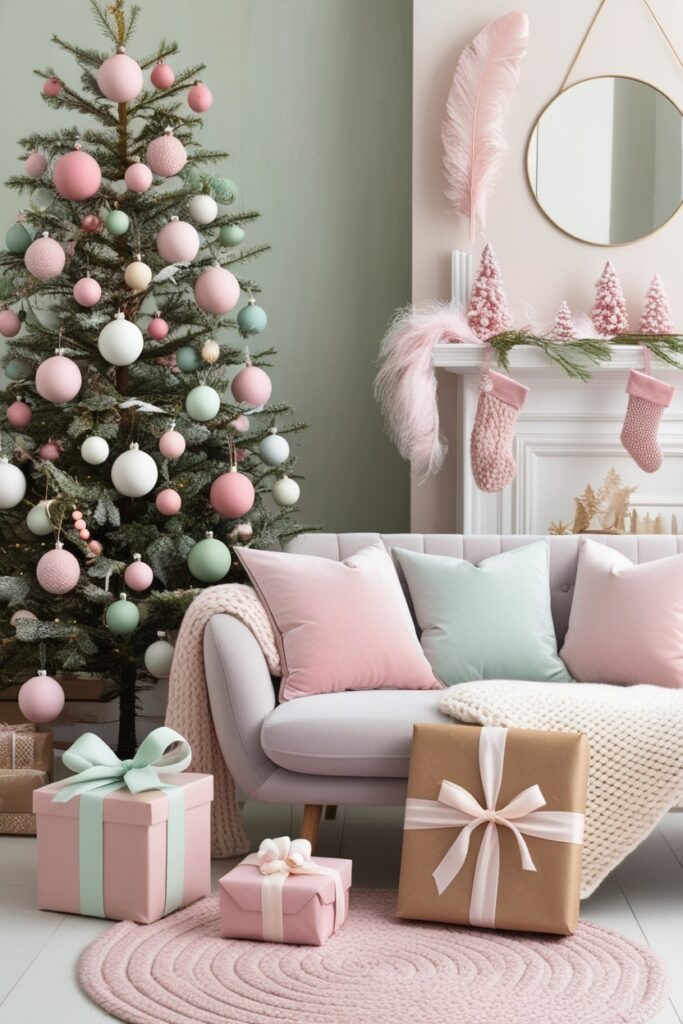 Decorate your tree with pastel baubles and white feathers. Add a soft pink velvet pillow or a knitted pastel throw. The result feels whimsical but grown-up. Not too sweet, just dreamy enough.