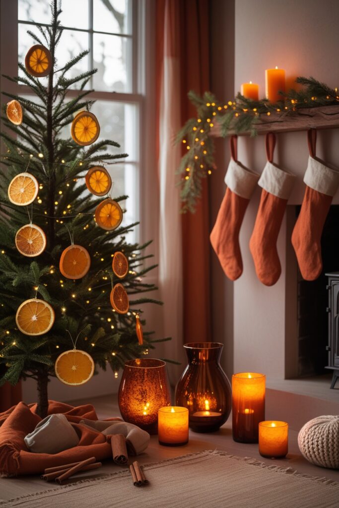 Hang dried orange slices on your tree. Place cinnamon sticks in small vases with fairy lights tucked around. Add amber glass candles that glow like firelight.