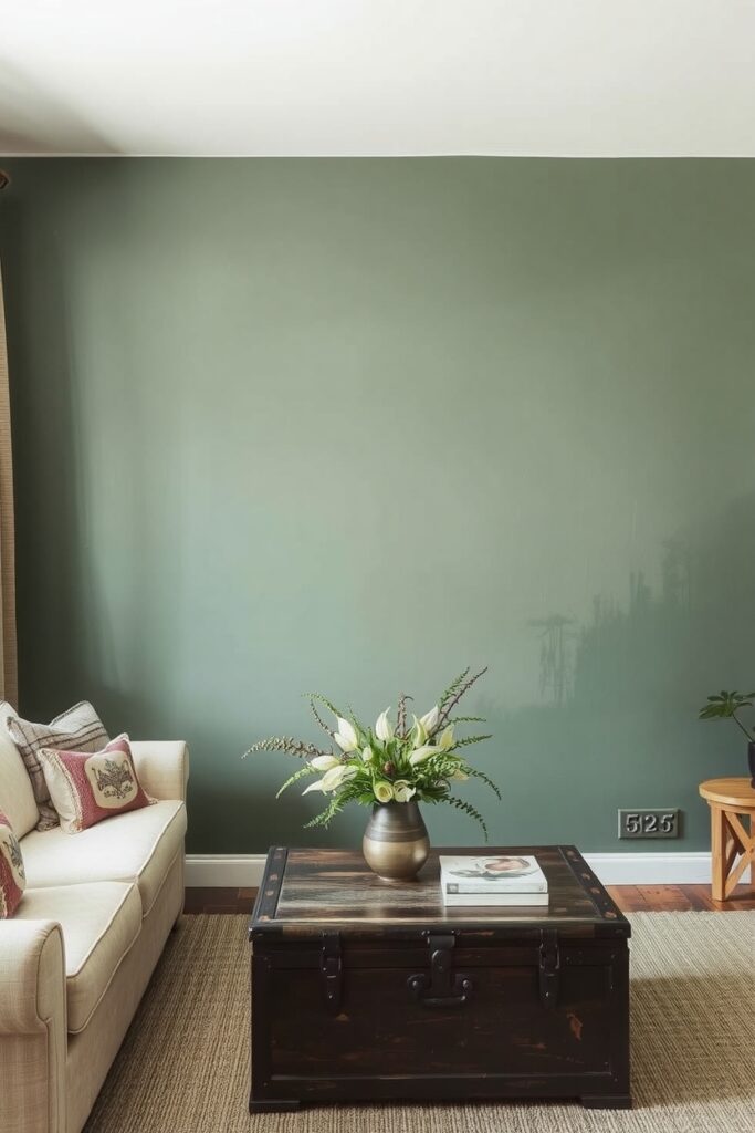 The kind of wall that changes color through the day. Morning light makes it look pale sage. Evening shadows deepen it into olive dusk. You’ll find yourself staring at it when conversations drift away.