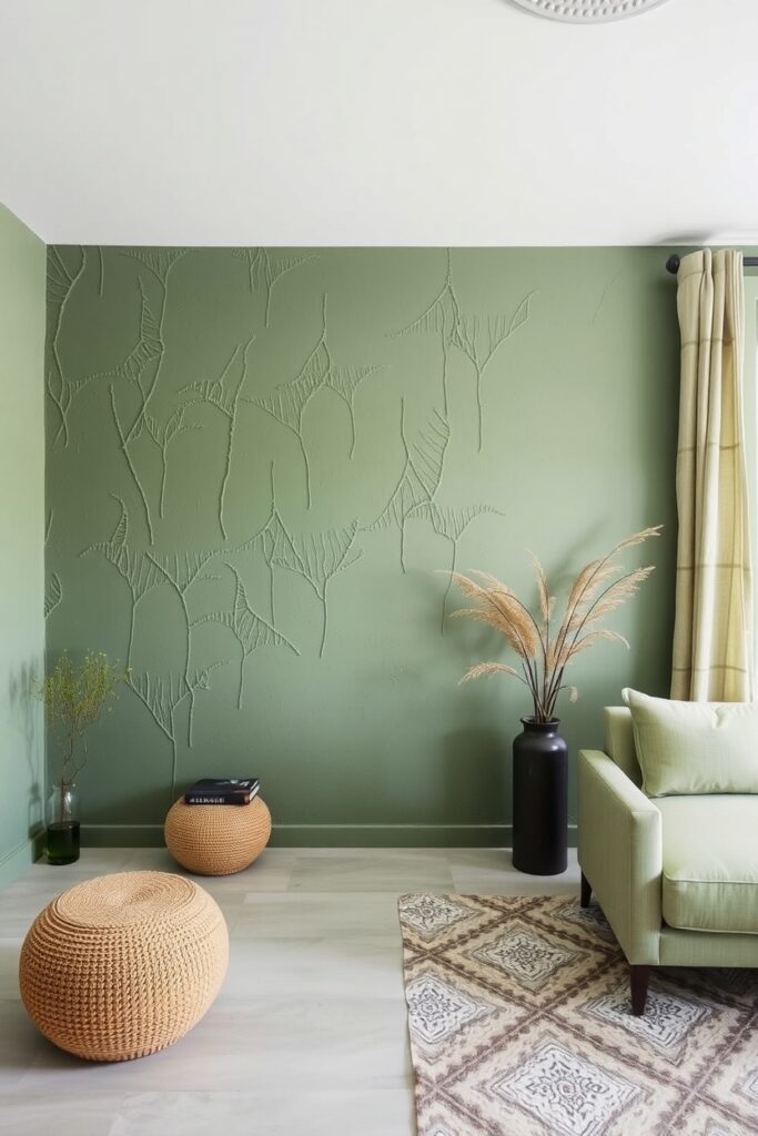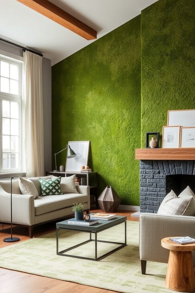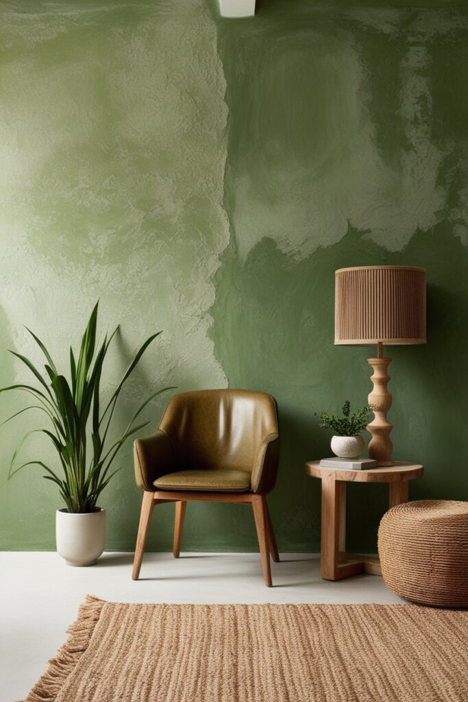 Imagine a green wall that doesn’t look painted it looks grown. Not fake moss panels, but a textured limewash finish that softly mimics the uneven tones of moss in a damp forest.