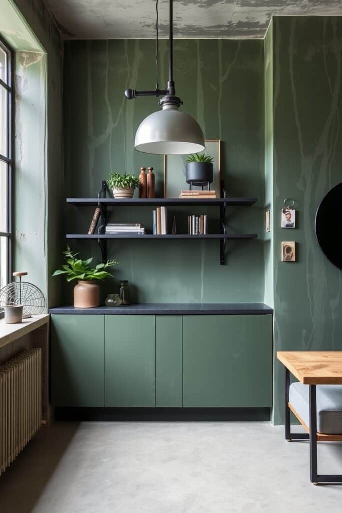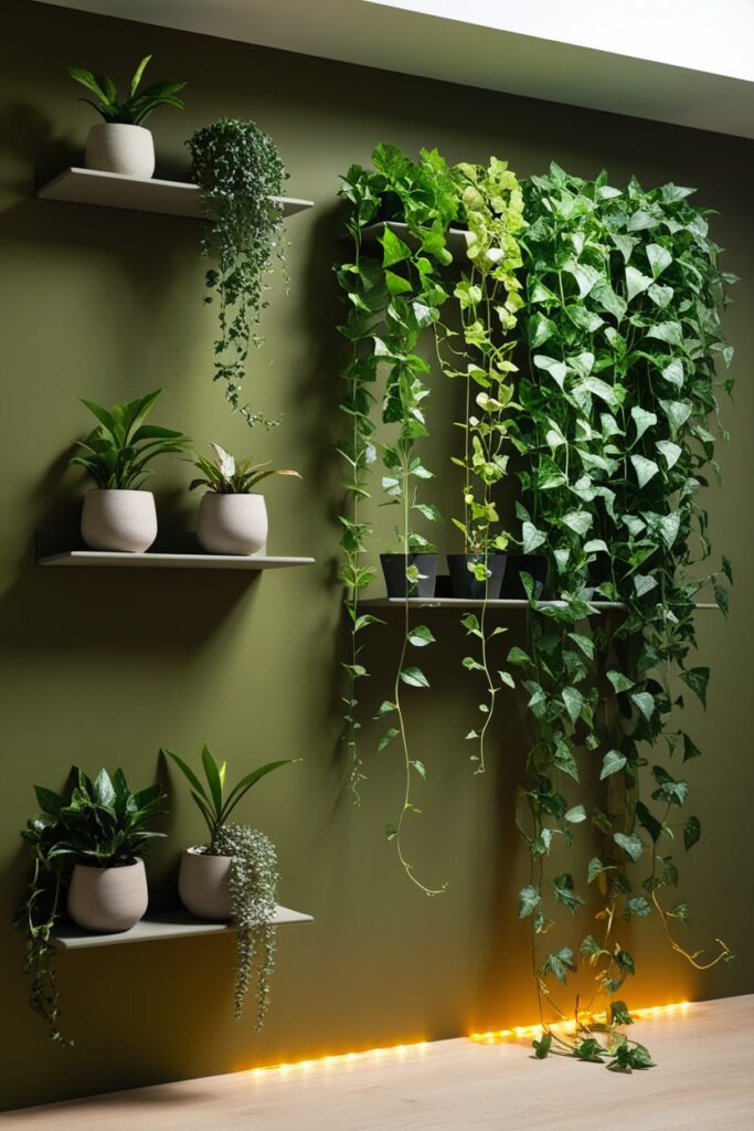 Now, let’s go bolder. A real green accent wall that combines structure and life paint your wall in a rich olive tone, then add slim floating shelves that hold potted trailing plants.