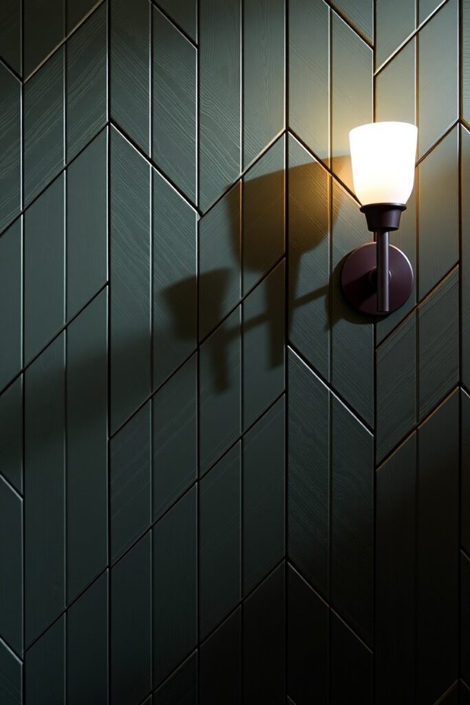 Sometimes geometry speaks louder than color. Imagine slim wooden planks arranged in a chevron pattern, painted in a smoky pine green, matte finish.