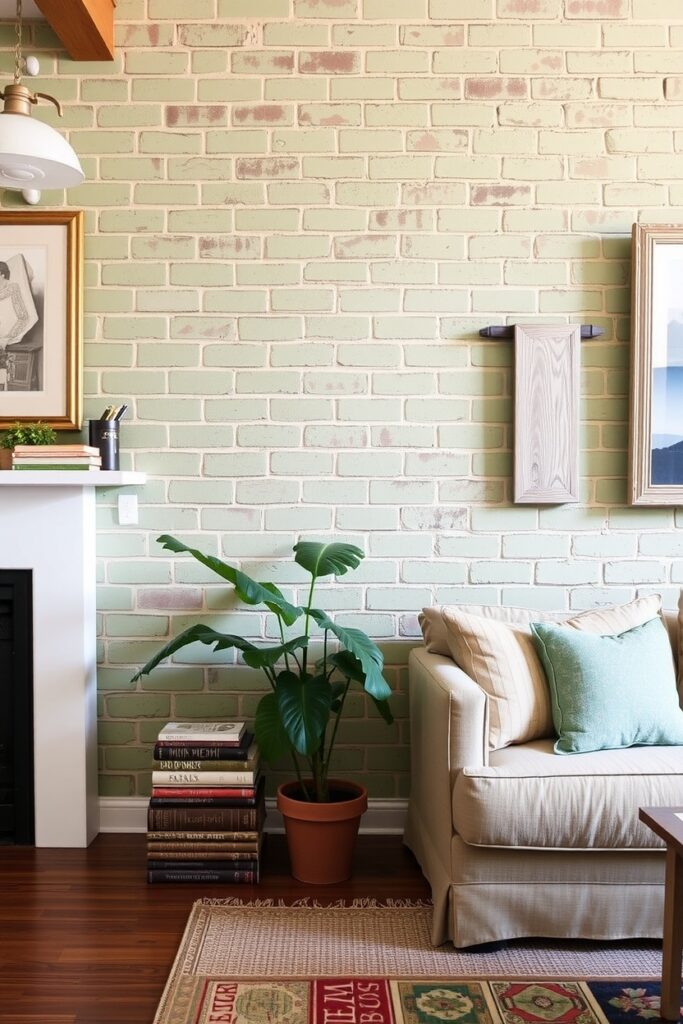 Rustic yet classy green-washed clay bricks are unexpected, but oh, they work. Paint over exposed bricks with a diluted sage wash, allowing the red tones to peek through faintly.
