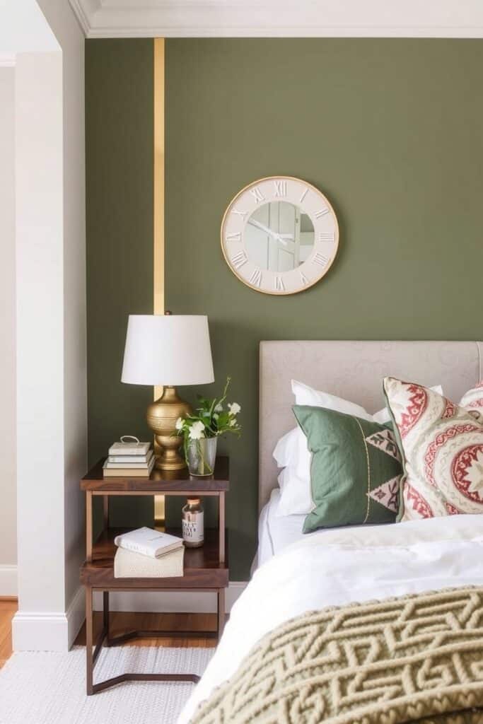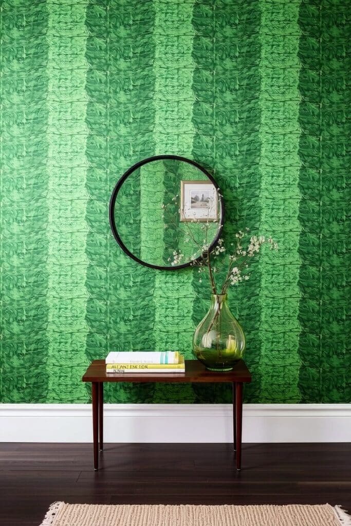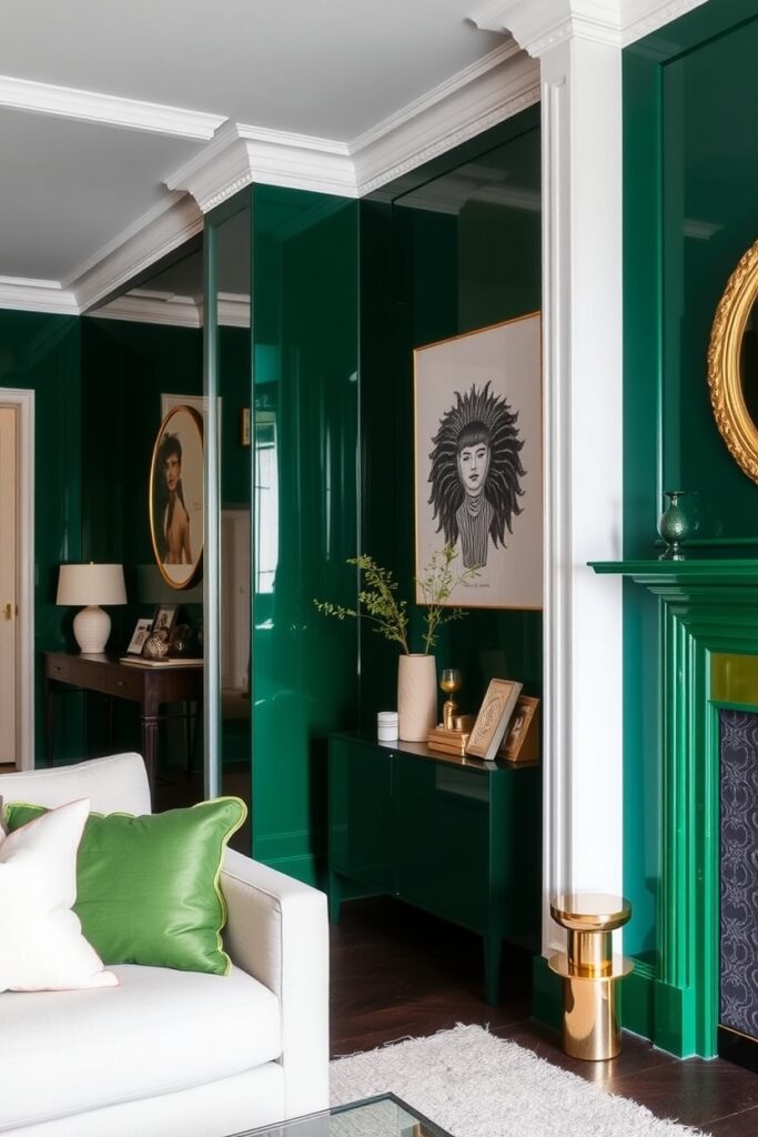 Here’s something daring: embed thin brass strips in your green accent wall. Either geometric patterns or freehand curves whatever suits your soul.