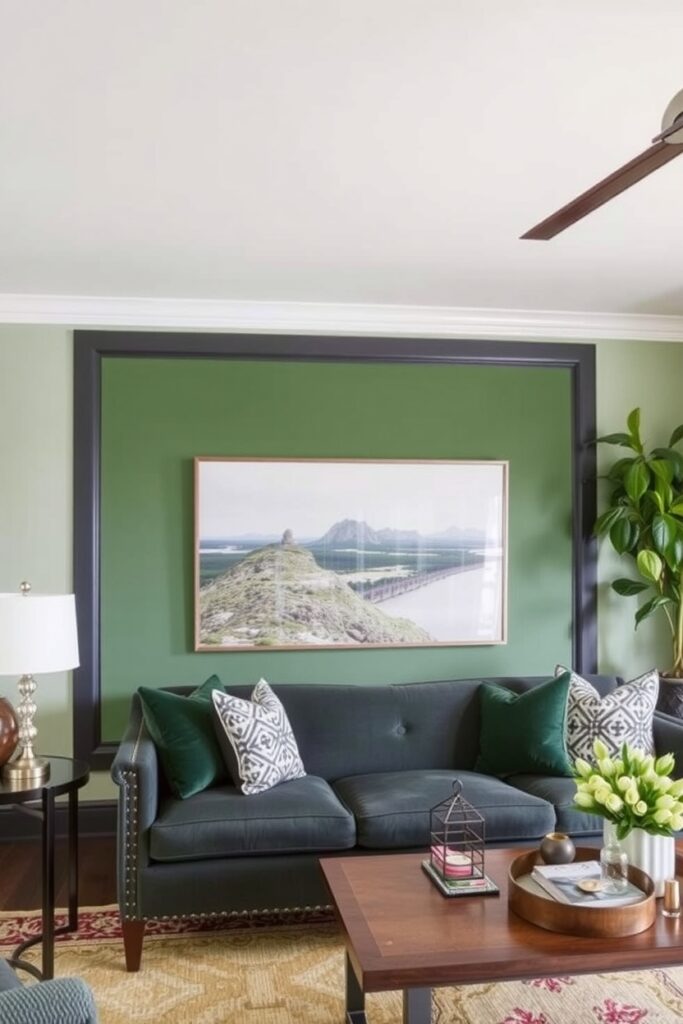 Frame your green accent wall with charcoal gray borders — like a subtle picture frame, maybe four inches wide.