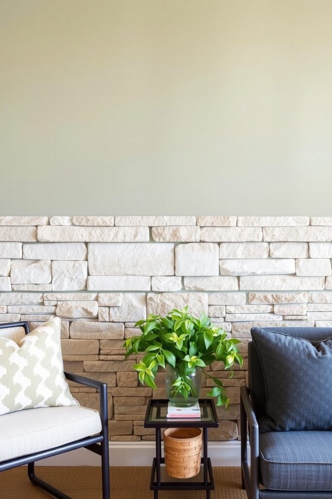 Combine a sage-painted wall with a horizontal strip of rough natural stone maybe limestone, maybe granite.