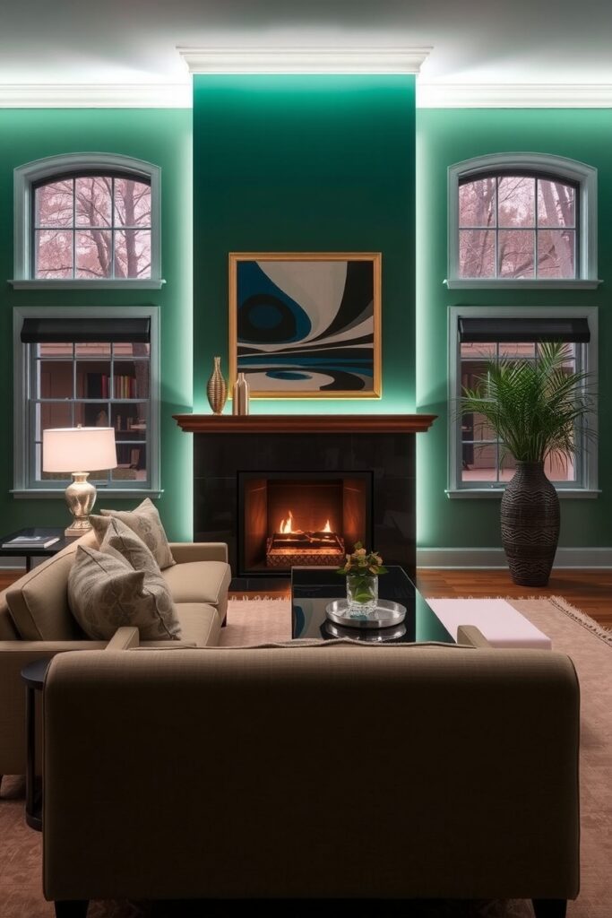 Cozy doesn’t always mean soft. Sometimes, cozy is about depth about reflecting light in ways you don’t expect. A high-gloss green lacquered wall can make your living room shimmer like an emerald gemstone.