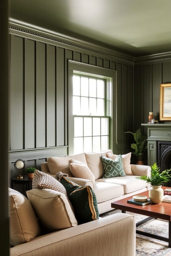 Keep your couch soft and neutral. Maybe add one piece of brass decor a lamp or a frame so the whole space doesn’t drown in green. Balance is the art here.