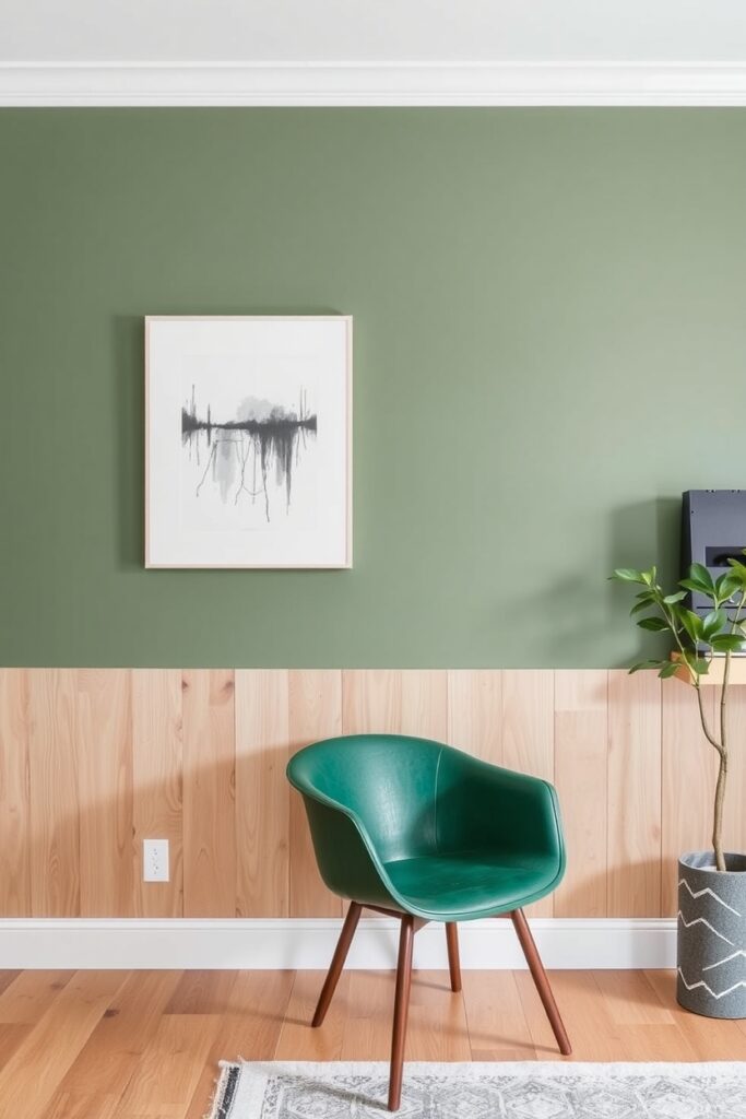 Design thrives on contrasts. Try a half-and-half accent wall the top in a deep matte sage, the bottom in smooth light oak panels.
