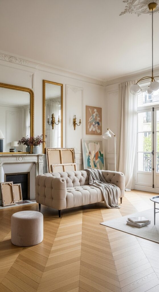 Think high ceilings, tall windows, sheer curtains moving like whispers, and pale oak planks underfoot catching every little flicker of sunlight. The Parisian style never really dies it just gets more undone.