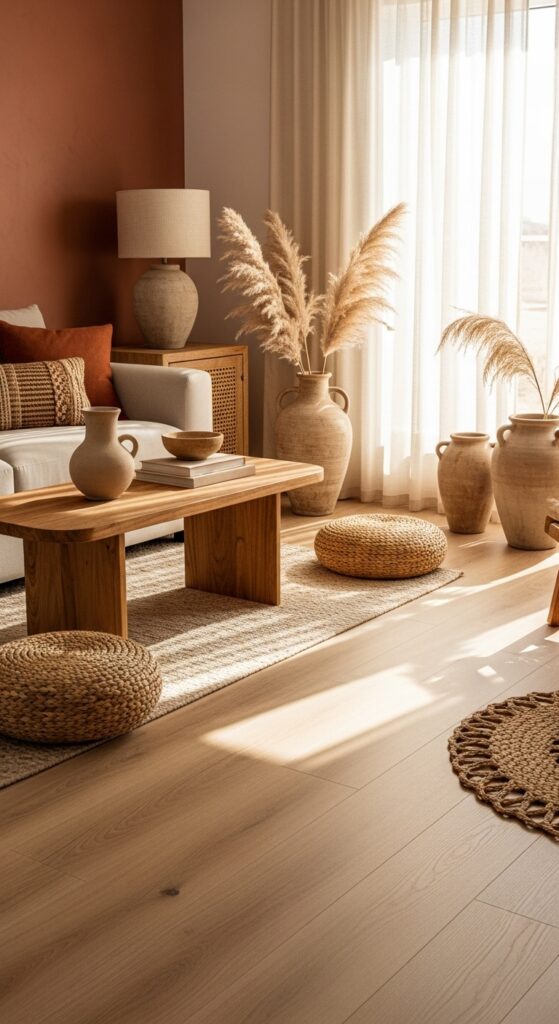 What ties it all together is tone. The wood floor’s pale warmth echoes through everything warm fabrics, tan leather, woven baskets. You can even go wild with colors if you balance them with natural textures.