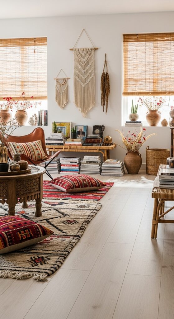 Layer vintage rugs (maybe a little frayed, maybe not), mismatched chairs, and an old trunk that’s pretending to be a coffee table. Toss in artwork that doesn’t match frames. It’s fine. It works.