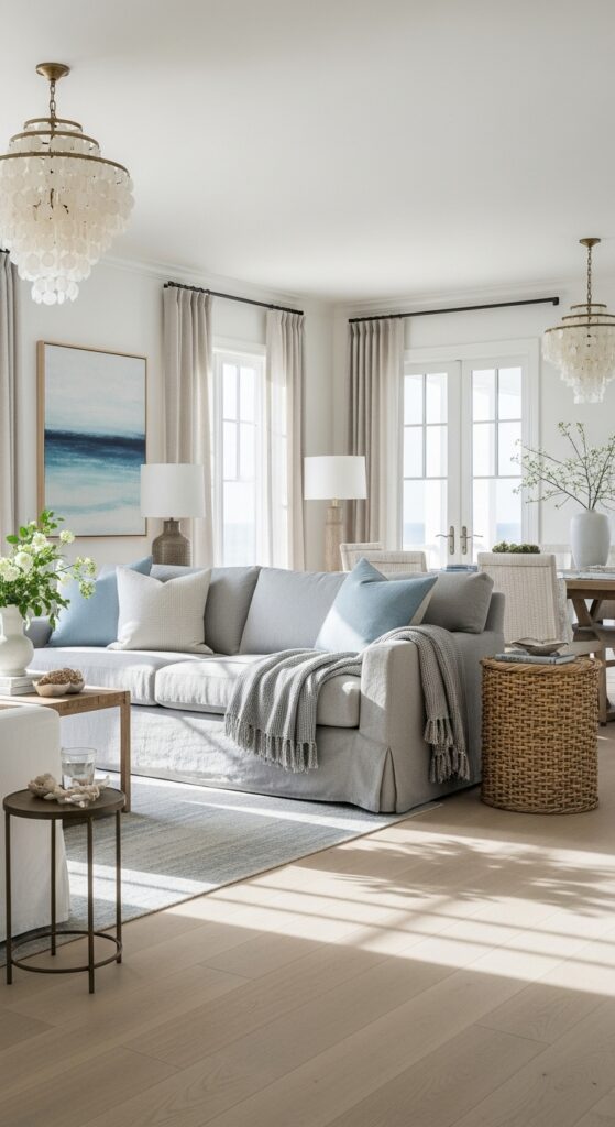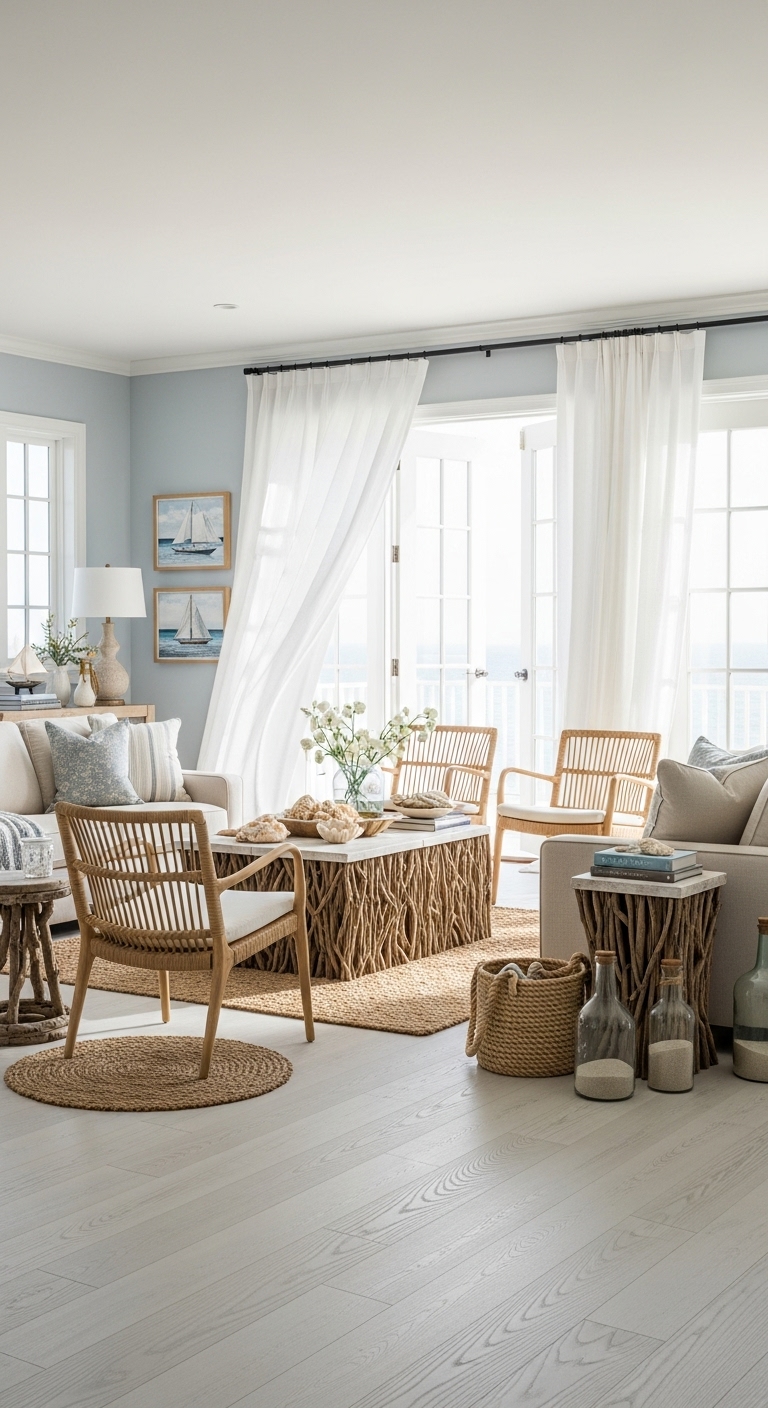 Mix textures that feel sun-aged: linen slipcovers, rope baskets, maybe a bleached wood bench that’s seen a few storms. Don’t be afraid of a few nicks and dings. Coastal style isn’t precious it’s human.