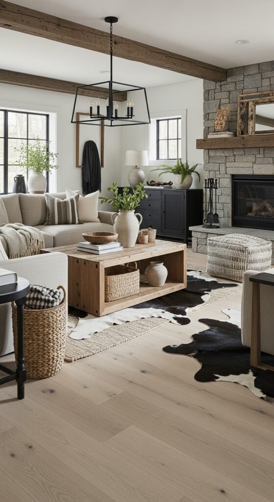 You know that feeling when something looks brand new but feels like it’s been there forever? That’s the sweet spot for a modern rustic living room. The light hardwood floor is the bridge it keeps the rough charm from turning too heavy, too “cabin in the woods.”