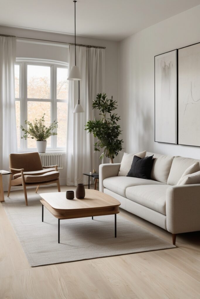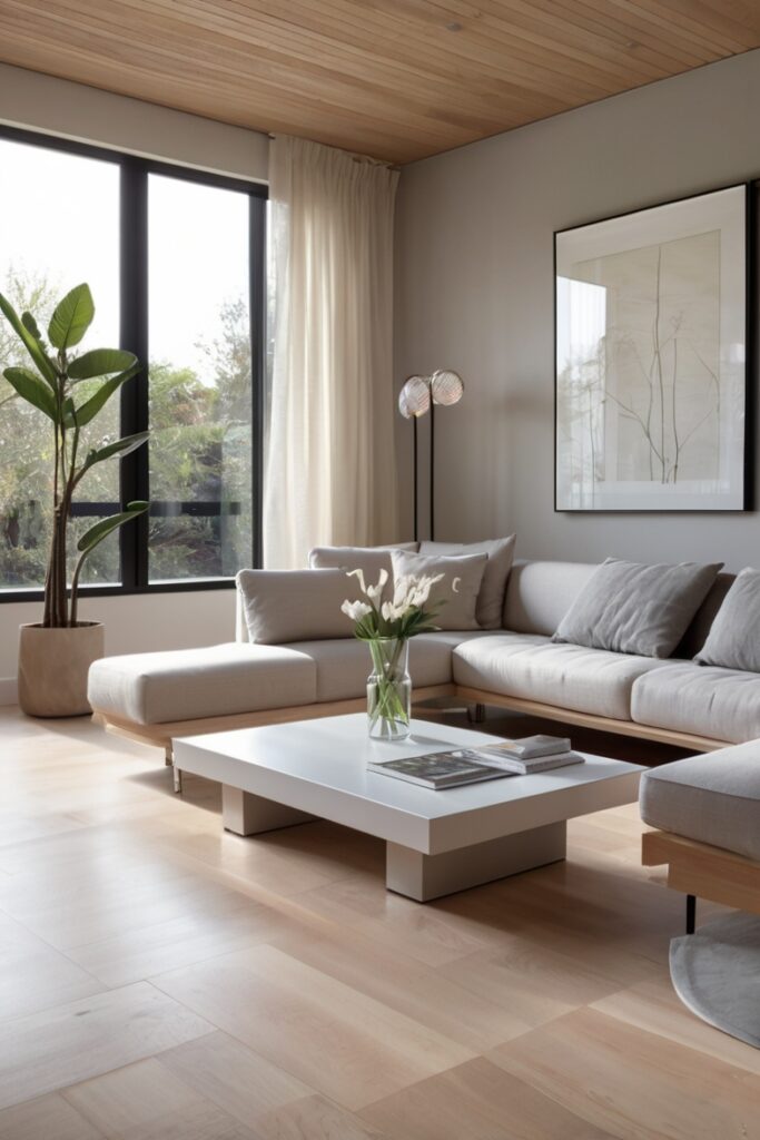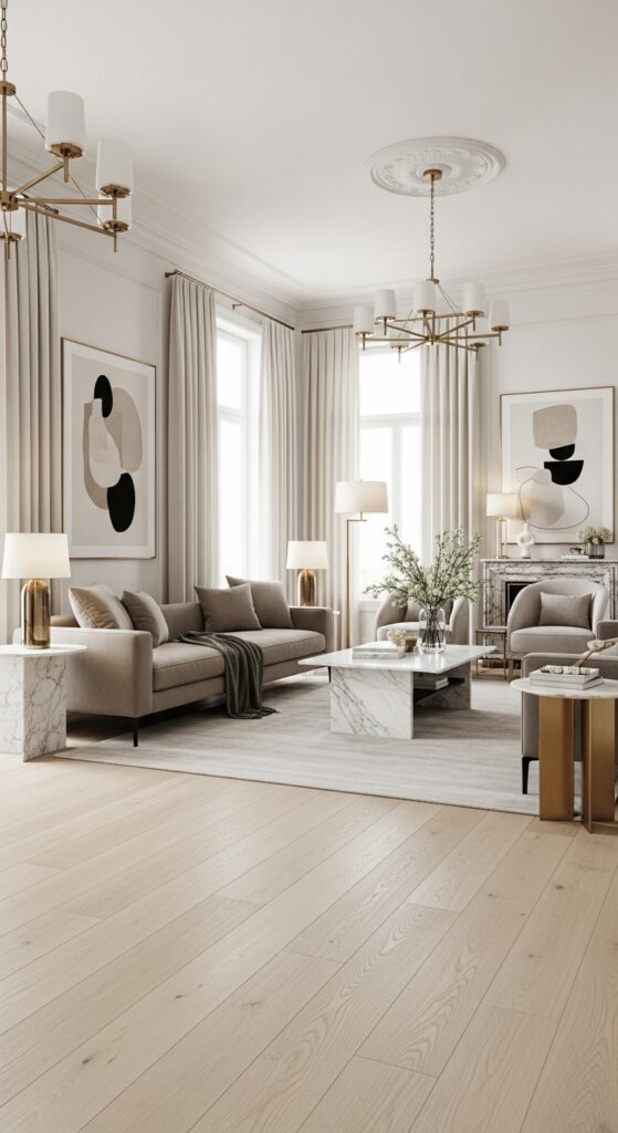 Furniture? Low, natural, simple. Pale wood coffee tables that almost match the floor (but not exactly). Creamy textiles, brushed brass lamps, maybe a whisper of pale sage somewhere like a leaf that forgot to fade.