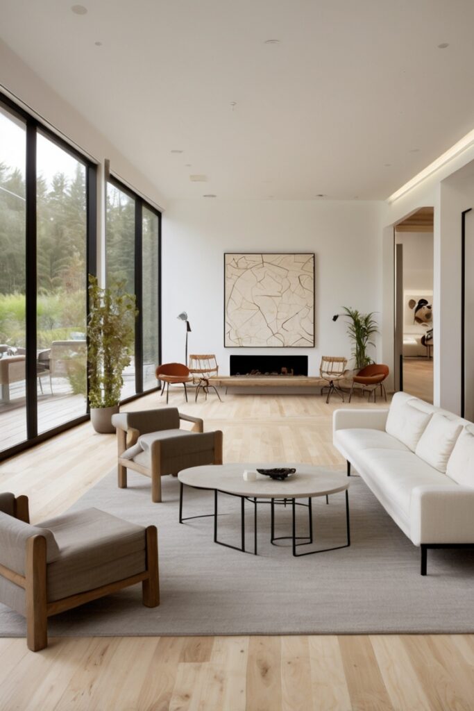 This idea’s for the modern apartments or glass-heavy homes where boundaries dissolve and everything’s kind of… one space. Light hardwood floors are essential here; they make all those open zones flow naturally together.