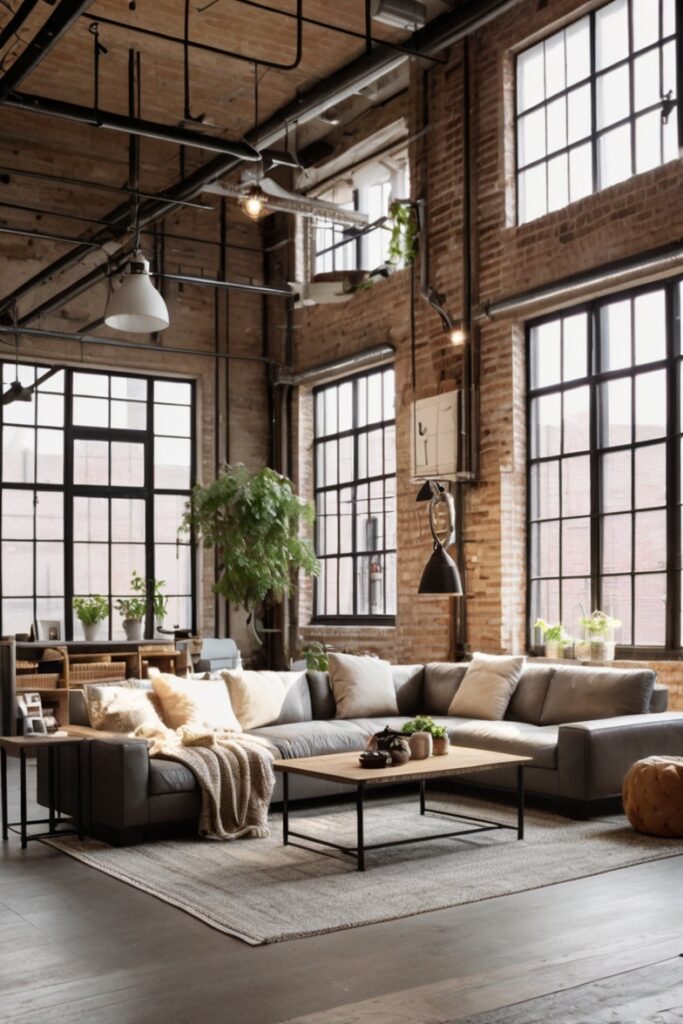 Use reclaimed wood beams or a chunky oak coffee table with a few soft linen cushions thrown on top. Balance the grit with warmth cream throws, tan leathers, raw ceramics that look like they’ve been sculpted by someone’s slightly impatient hands.