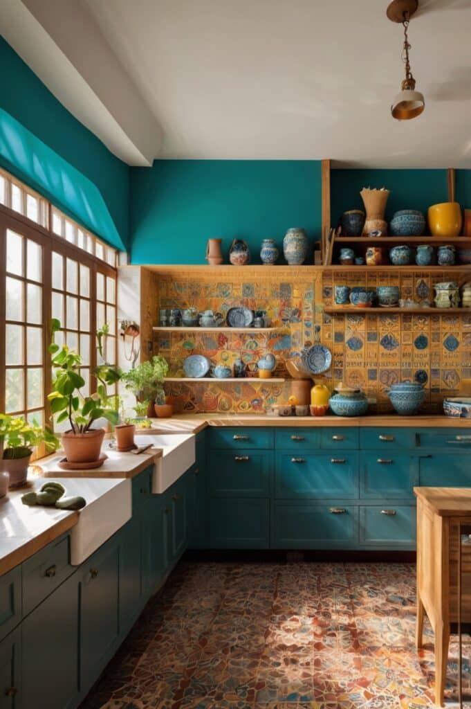Adobe walls in kitchens feel like they’ve been kissed by the desert sun. Rough, earthy, baked with time. Against that, bring in cabinets painted in a deep smoky blue, the shade of twilight in Oaxaca.