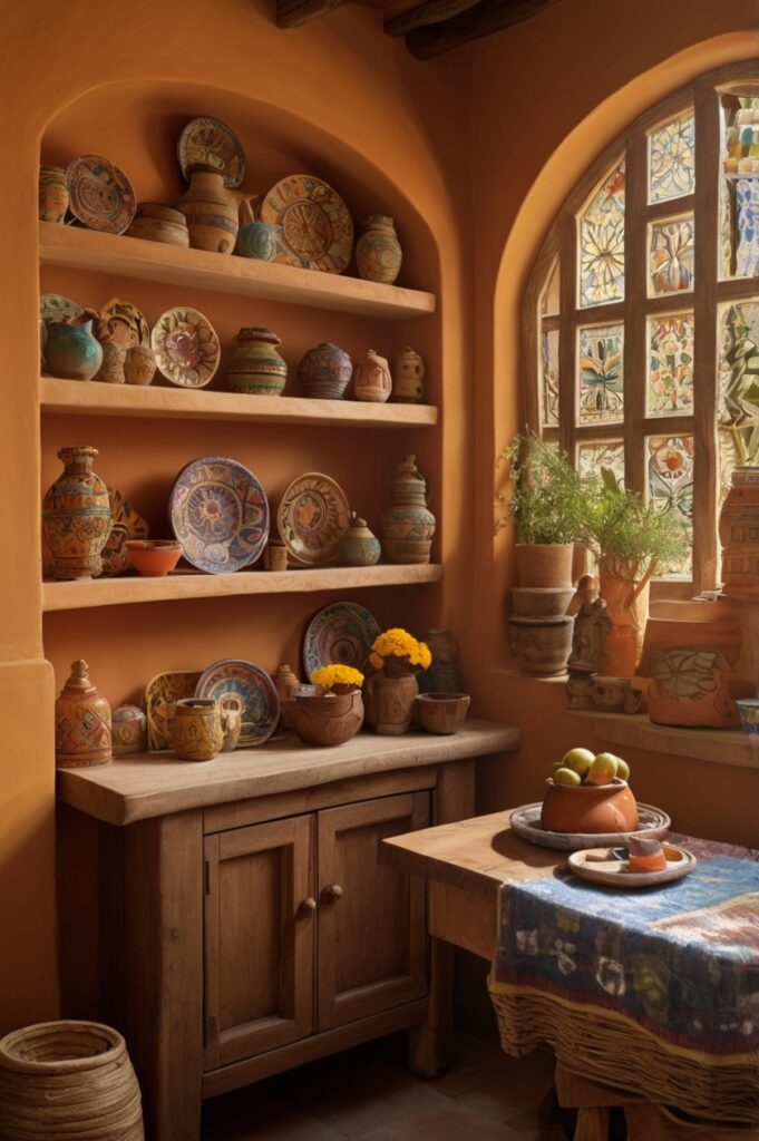 Tuck a small niche into the kitchen wall and fill it with folk art maybe a Virgin Mary figurine, maybe a carved jaguar. It’s part shrine, part decor, part reminder of roots.