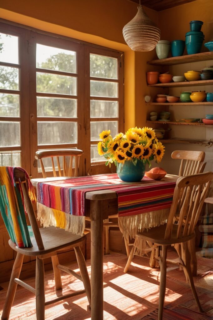 Exposed wooden beams feel strong on their own, but in Mexico, they rarely stay plain. Stencil bright patterns reds, greens, even golden suns right onto the wood. Suddenly the ceiling isn’t just structure, it’s story.