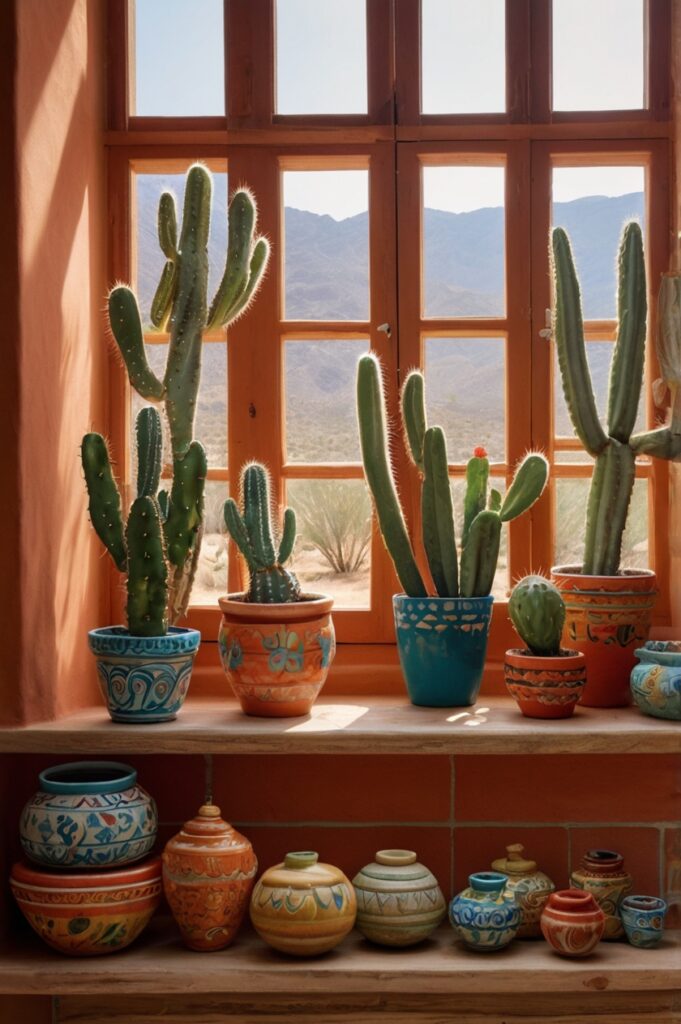 Line your kitchen windowsill with squat clay pots, each holding a cactus or succulent. Paint the pots in zigzag patterns or bold dots. The greens pop even more against the chaos of color.