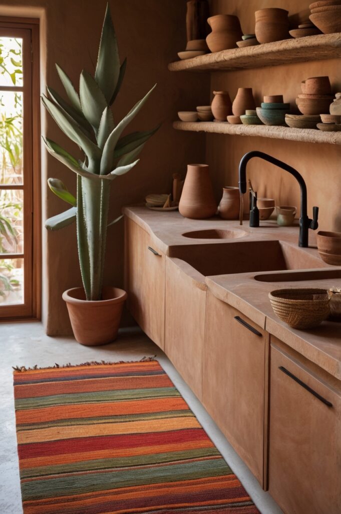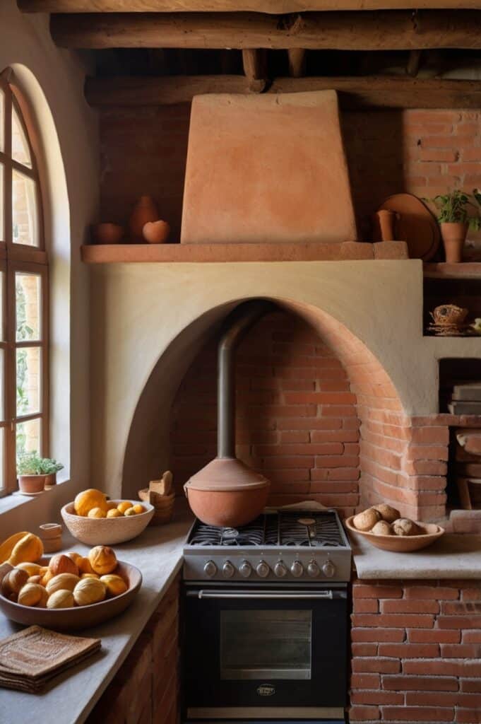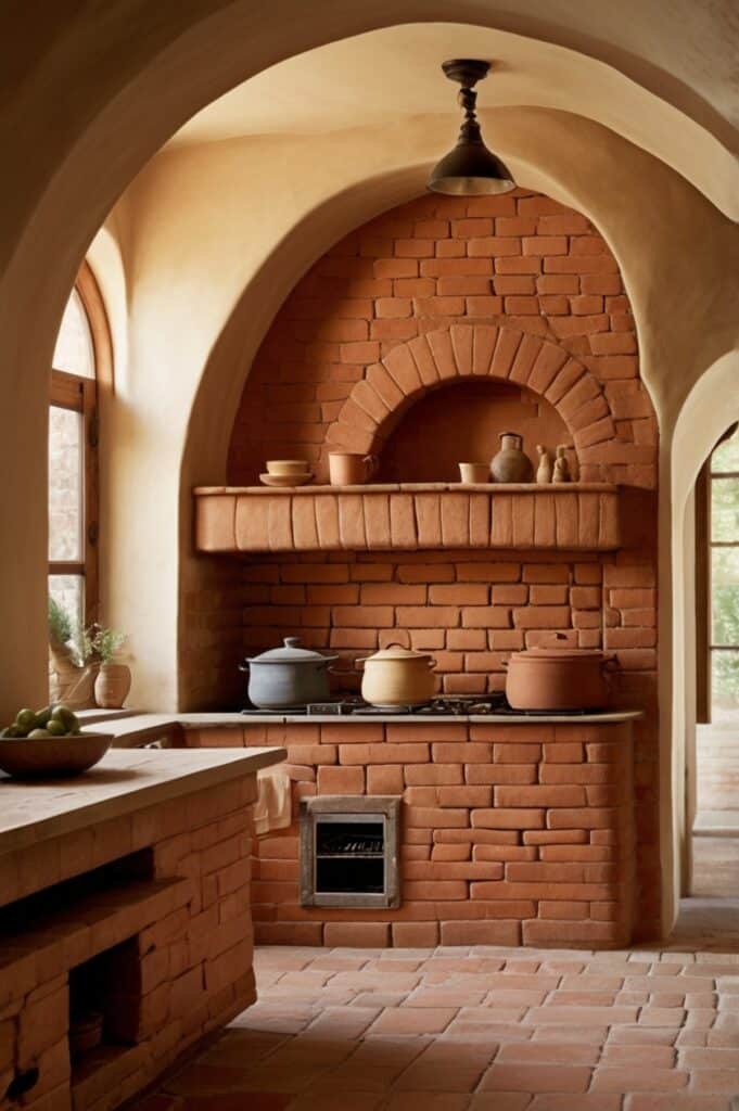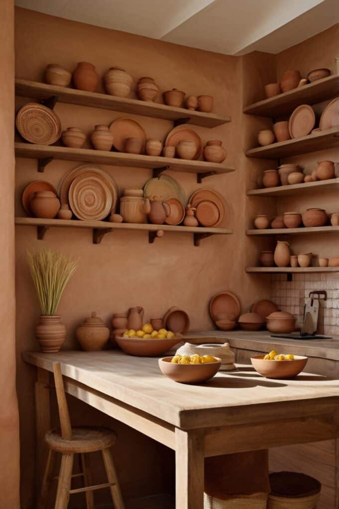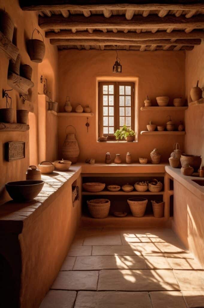 Forget upper cabinets go with open niches carved into the walls. Fill them with terracotta jars in different sizes, each one stained with time and use. Some jars hold beans, others spices, others nothing but air and memory.
