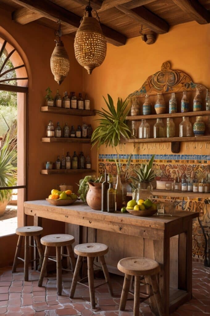 Every Mexican kitchen deserves a corner that doesn’t cook food but serves spirits. Build a tiny rustic bar lined with mezcal bottles, clay shot cups, maybe even a salt rim dish. Keep it casual but deliberate.