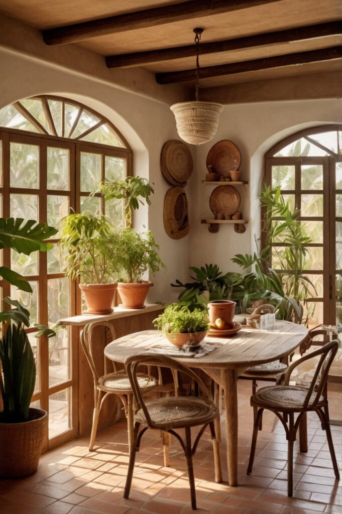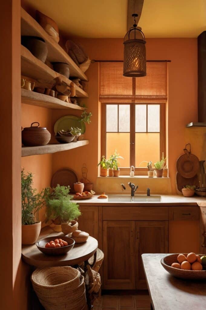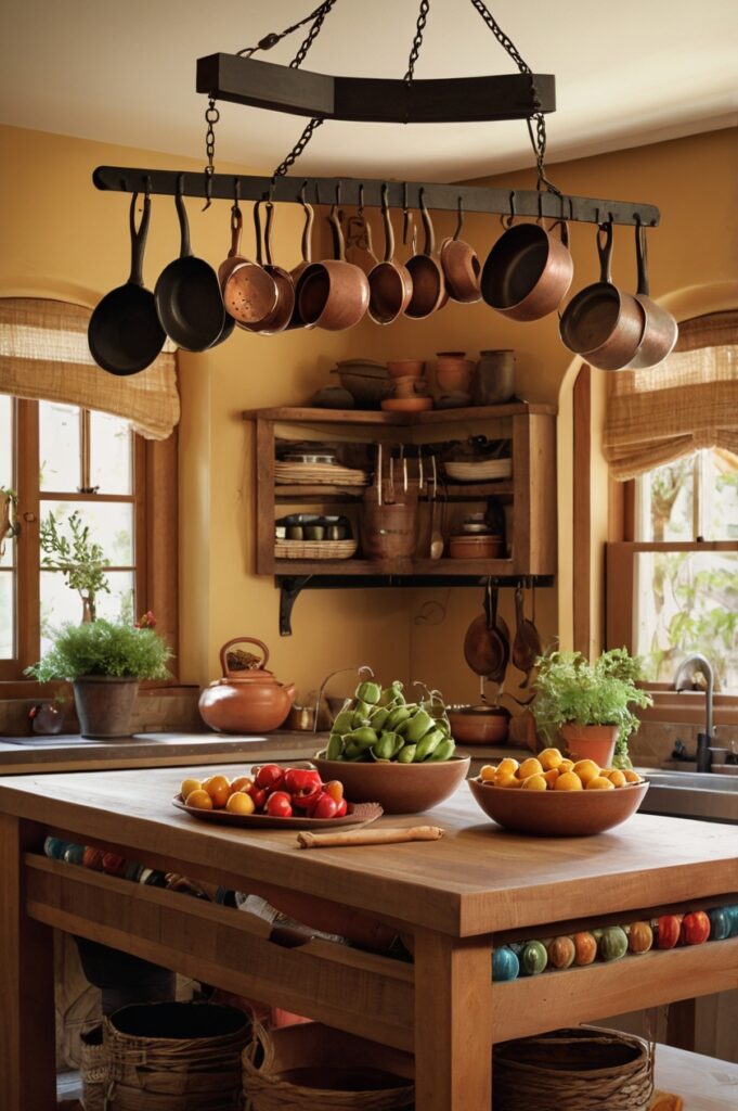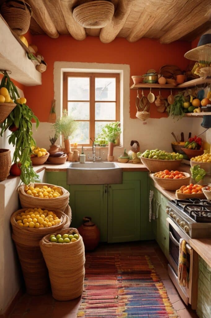 Hang woven baskets from the ceiling like you’re in a mercado. Onions, garlic, peppers, even flowers let them dangle overhead in organized chaos. The air fills with scents before you even start cooking.