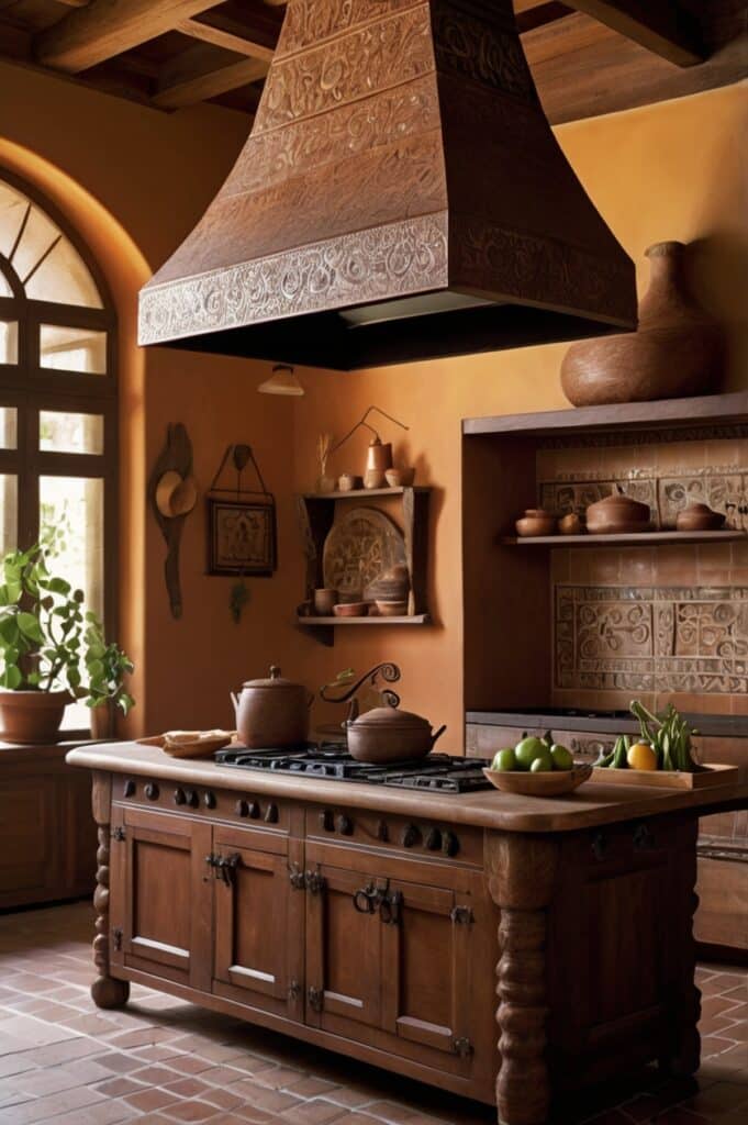 That patina doesn’t come from polish it comes from living. A Mexican kitchen with a hood like this feels less like decor and more like a place where generations have stirred pots. And honestly, isn’t that the whole point?