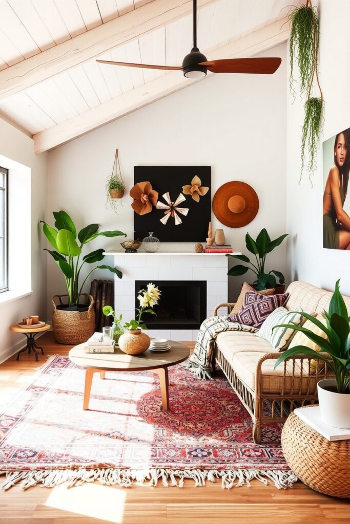 Take a clean sunken layout and loosen it up with bohemian touches woven throws, layered rugs, and a few wild plants.