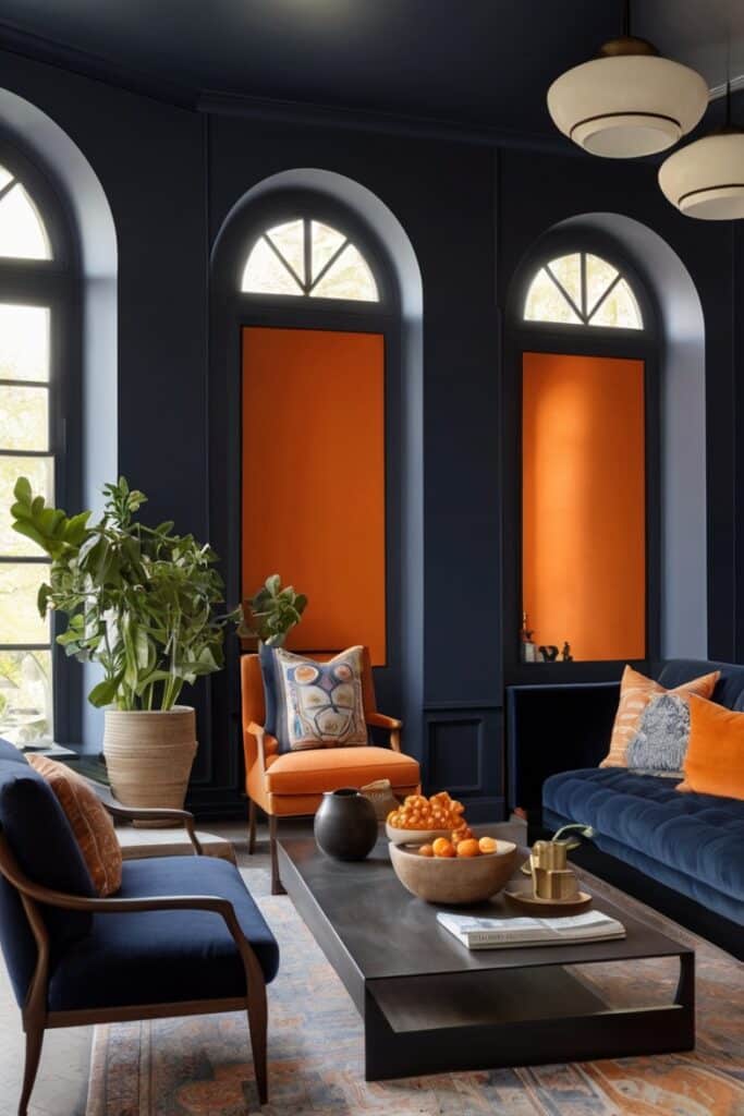If your living room has archways or alcoves, paint the outer frame navy. Let them look quiet and shadowy from the outside. But then, surprise: paint the inside of the arch or niche a blazing orange.