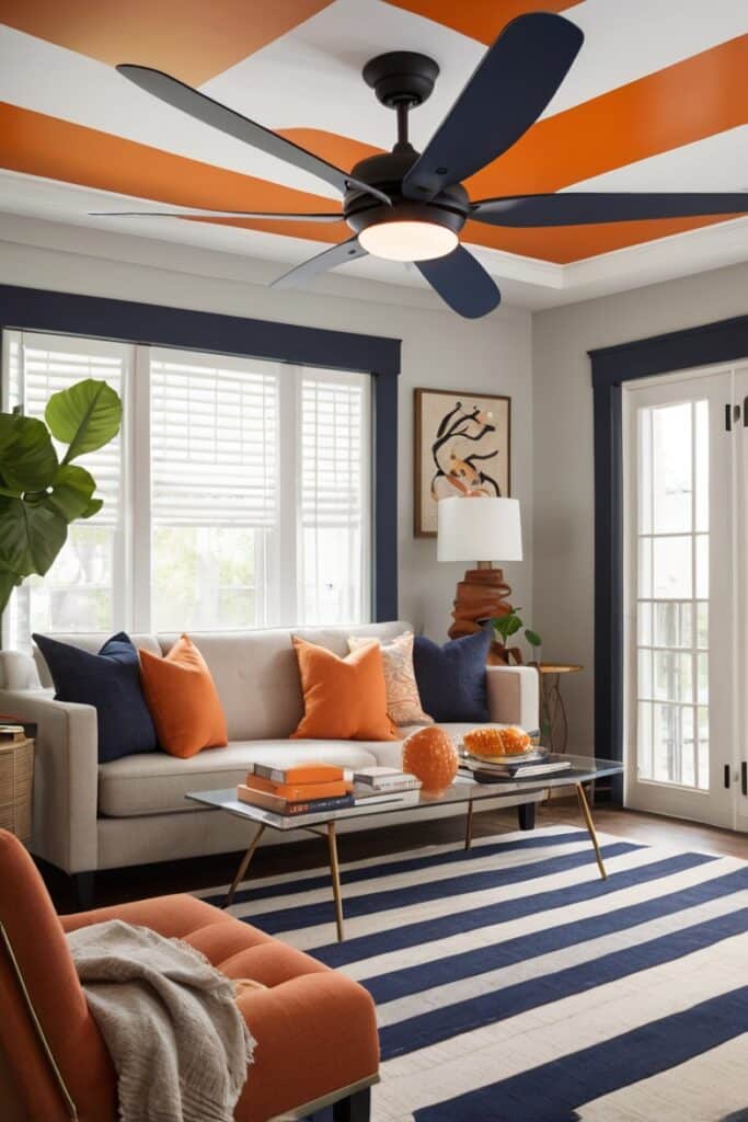 The color clash feels deliberate, modern, and surprisingly fun. When the blades spin, the orange flashes against the navy backdrop, making the ceiling feel alive. Suddenly, you don’t just have air movement you’ve got design in motion.
