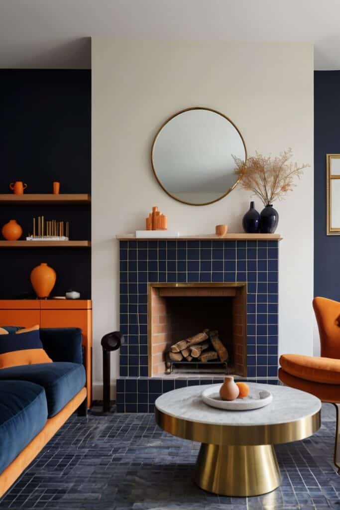 Textures can say more than colors alone. Navy velvet on a sofa or armchair feels rich, moody, even a bit indulgent. Place an orange glass coffee table or side table next to it, smooth and almost glowing when the light hits.
