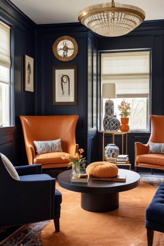 Paneling has made a comeback, but it doesn’t need to stay muted. Deep navy paneling feels modern, almost like an old library that decided to start over. Against that backdrop, bring in sleek orange leather chairs.