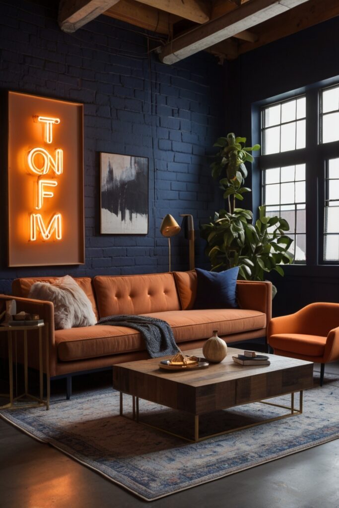 Neon is back, not the tacky diner type, but sleek and playful. Against a flat navy wall, a glowing orange sign becomes the heartbeat of the room. Maybe it’s a single word, maybe a quirky line, maybe just an abstract squiggle.
