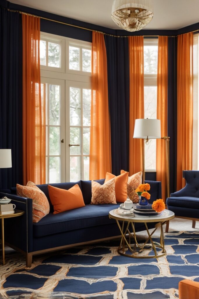 Drapes don’t always need to choose one mood. Go heavy with navy fabric that puddles on the floor, dark and elegant. Then add a second layer: sheer orange panels that soften the edges.