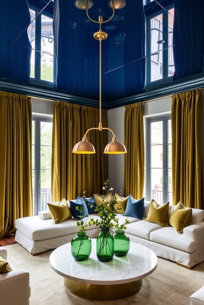 Then you drag olive drapes from floor to ceiling and watch the tension play out between slick gloss and earthy fabric. One side shouts, the other side whispers, and the room balances in between. Ceiling as water, curtains as leaves—nature disguised in luxury.