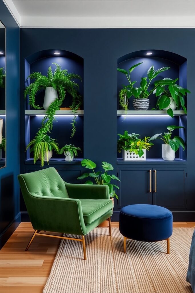 This one’s straight out of 2025’s obsession with indoor ecosystems. Picture a navy alcove built into the wall, shadowy and sleek, and inside it you grow climbing plants that weave up the sides. The green sneaks into the depth of the navy like it was always meant to be there.