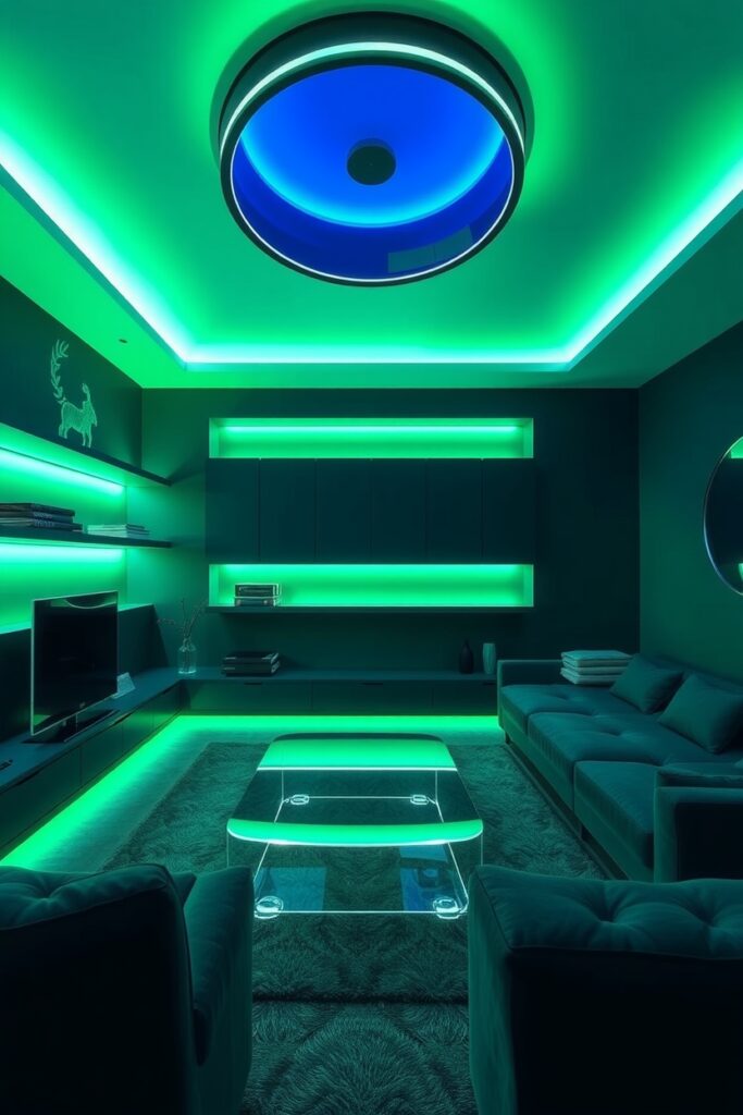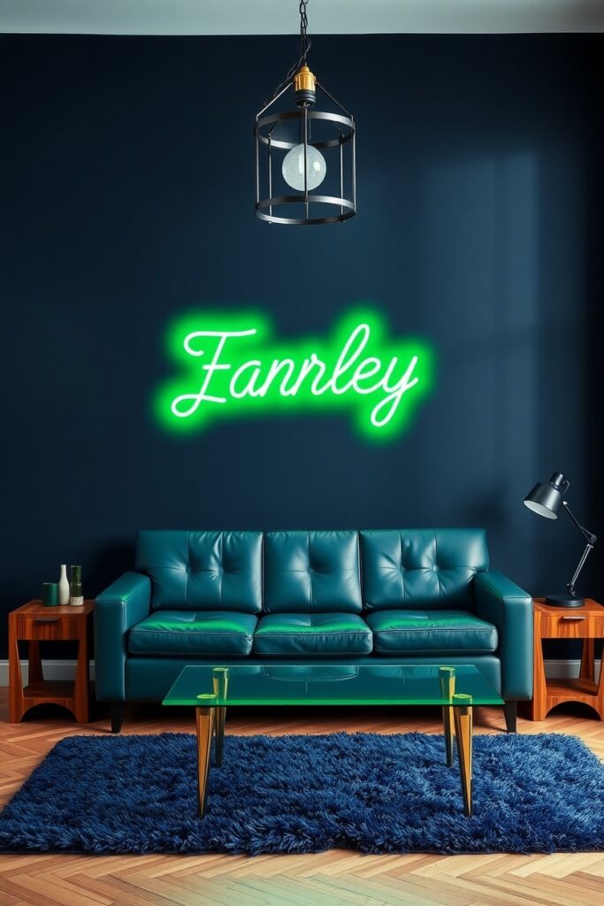You’ve seen neon lights in pink and blue, sure. But emerald neon tubes glowing against navy matte walls? That’s a 2025 move. It looks cyber but still organic, like digital jungle vines growing in lines across the room.