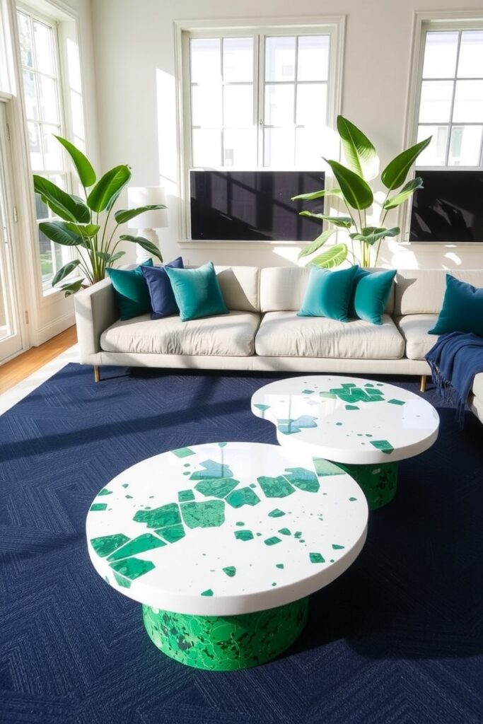 7. Green Terrazzo Coffee Tables on Navy Rugs